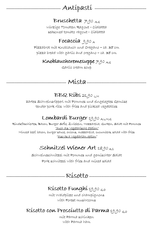 Lombardi Restaurant Menu